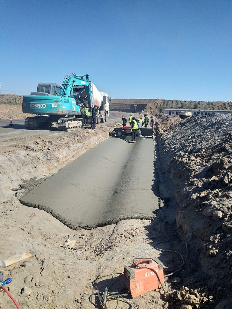 機(jī)器是用罐車進(jìn)行混凝土運(yùn)輸,挖掘機(jī)輔助上料。罐車來到現(xiàn)場以后,把料放到挖掘機(jī)的挖斗中,挖掘機(jī)跟著機(jī)器負(fù)責(zé)上料。這個現(xiàn)場經(jīng)過一天的調(diào)試做了大概210米,如果后期罐車的料不耽誤無一天預(yù)計(jì)能做350米左右。